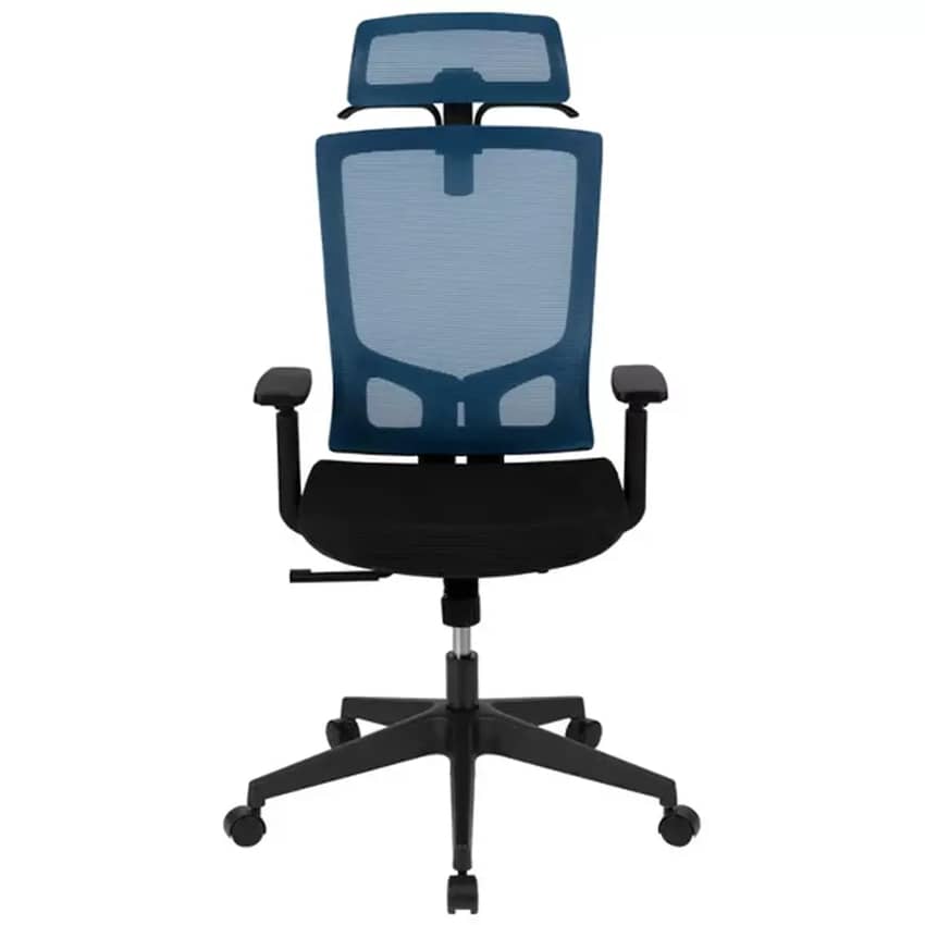 Experience superior comfort and support with the Flash Furniture Ergonomic Mesh Office Chair in Blue and Black. Designed for long hours at your desk, this contemporary executive chair features a breathable mesh back and seat for optimal airflow. The curved back with built-in lumbar support promotes proper spinal alignment, while the height-adjustable arms with pivot function provide excellent upper-body support. The 3-position synchro-tilt mechanism allows for synchronized back and seat movement, ensuring comfort all day. With pneumatic seat height adjustment, waterfall seat design, and a sturdy 5-star nylon base with dual-wheel casters, this chair offers exceptional ergonomics and style for any modern workspace. This chair has a weight capacity of 250 pounds, weighs 39 pounds, and measures 27 inches long, 37.5 inches wide, and 52.75 inches high. The seat measures 19 inches wide and 9 inches deep, the seat back measures 18.5 inches wide and 32 inches high, and the maximum height of floor to seat top is 22.25 inches high.