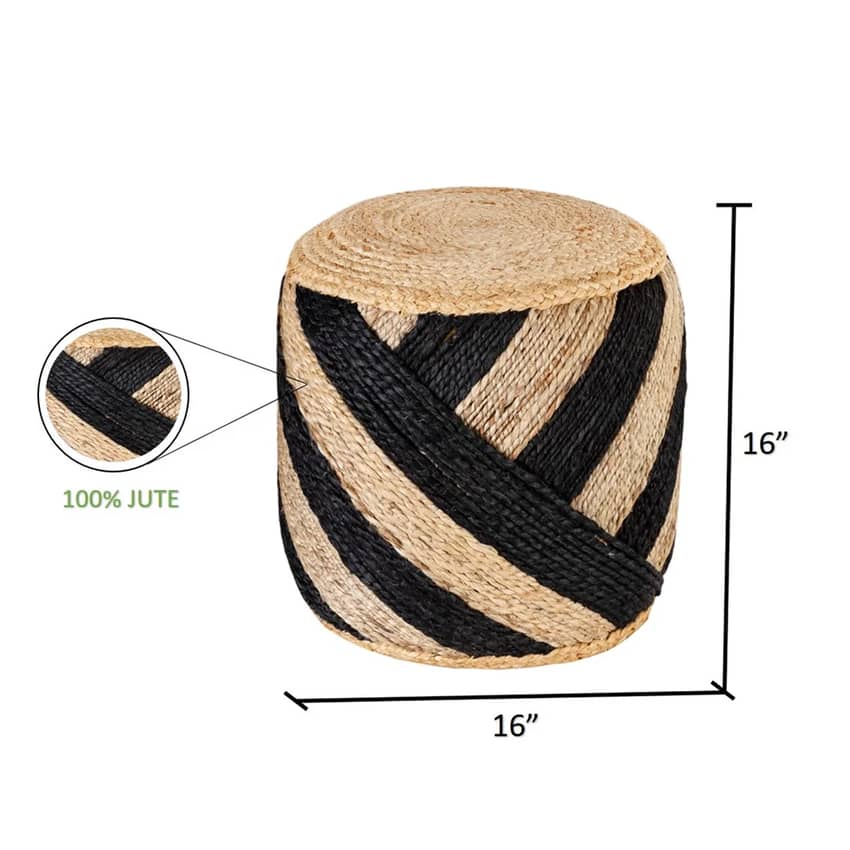 Add a touch of natural elegance to your home with the Albany Living Handwoven Jute Ottoman in Tan/Black. This versatile piece, crafted from 100% jute in India and filled with polystyrene beans, offers both comfort and sustainable style. Perfect as a footrest, a chic accent piece, or even a vanity stool, its handwoven texture and earthy tones bring warmth and character to any room. Please note that slight color variations may occur from the pictured product. This ottoman measures 16 inches wide and 16 inches high.