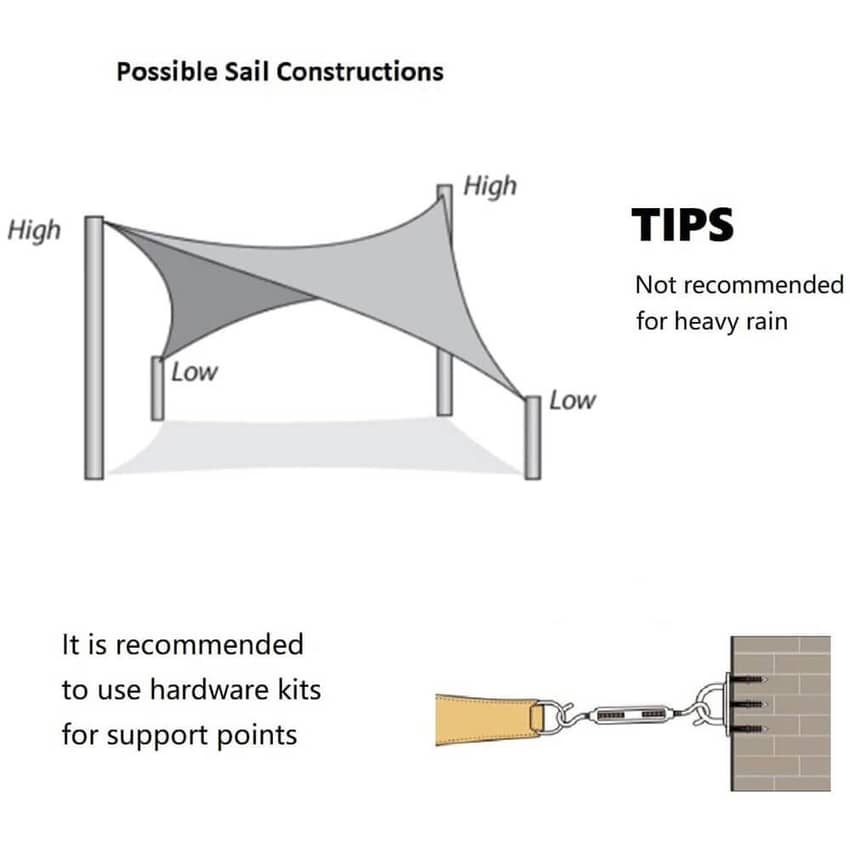 - Durable Construction: The shade sail canopy is a rectangular shape with curved sides, enhancing pull strength and preventing drooping. The sun sail is available in several stylish colors and sizes that you can choose from