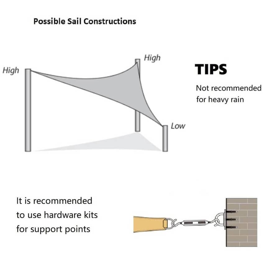 - Durable Construction: The shade sail canopy is a triangular shape with curved sides, enhancing pull strength and preventing drooping. The sun sail is available in several stylish colors and sizes that you can choose from