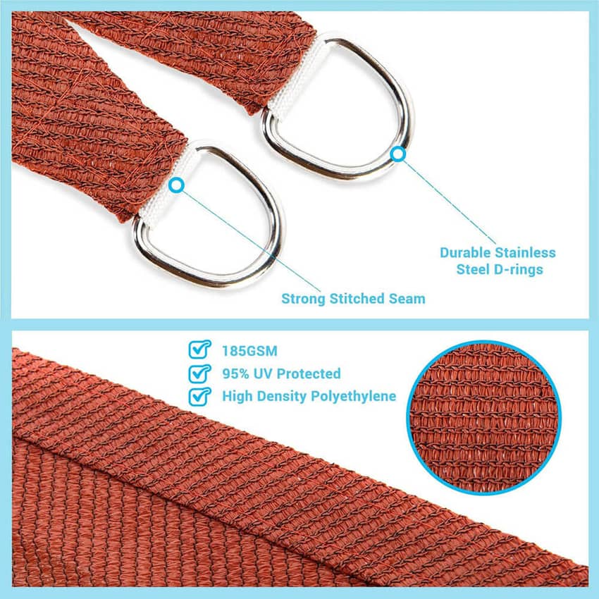 - High Quality: The patio shade has 100% High-Density 185GSM Polyethylene fabric, with strongly stitched seams and durable stainless steel D-rings. The fabric is breathable and 95% UV block, allowing air and light to pass through for a more comfortable space. This sail shade also comes with sturdy polyethylene ropes