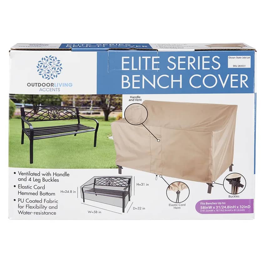 Protect your outdoor bench with the Outdoor Living Accents Elite Series Bench Cover. Designed to fit benches up to 58 inches, this cover safeguards your furniture from the elements. Crafted from durable, water-resistant PU-coated fabric, it offers excellent protection against rain, snow, and harmful UV rays. The ventilated design promotes airflow, preventing moisture buildup. With a convenient handle and secure leg buckles, this cover is easy to install and remove. This bench cover measures 58 inches wide, 32 inches deep, and 31.25 inches high.