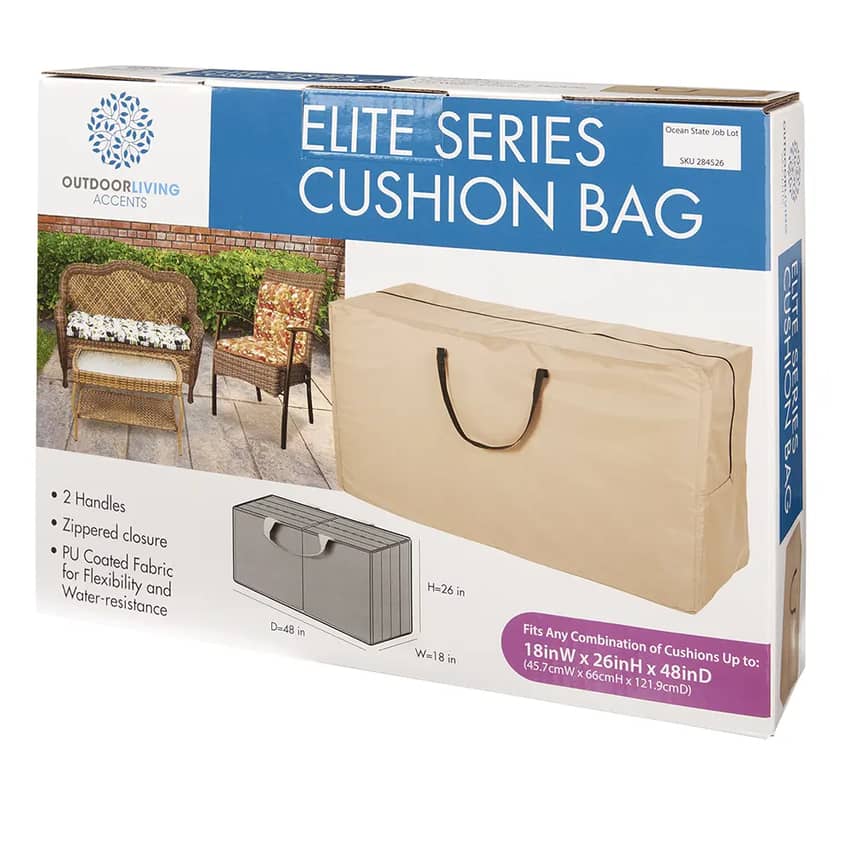 Safeguard your outdoor cushions with the Outdoor Living Accents Elite Series Cushion Bag. This spacious bag is crafted from durable, water-resistant PU-coated fabric, it protects against moisture, dirt, and mildew. Conveniently transport your cushions with the built-in handles. This cushion bag measures 18 inches wide, 48 inches deep, and 26 inches high.