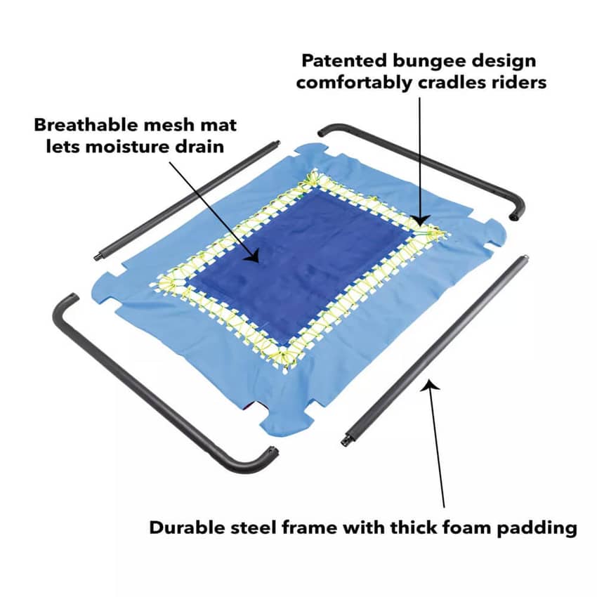 UV-resistant poly-oxford and poly-coated mesh mat resists the outdoor elements to last for many seasons of play, and breathable materials allow water to drain away - Bungee ropes provide a comfortable ride; holds up to 400 lbs