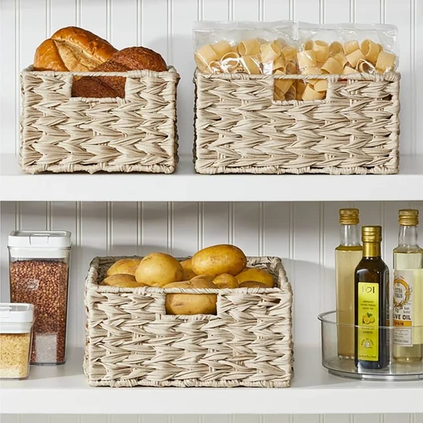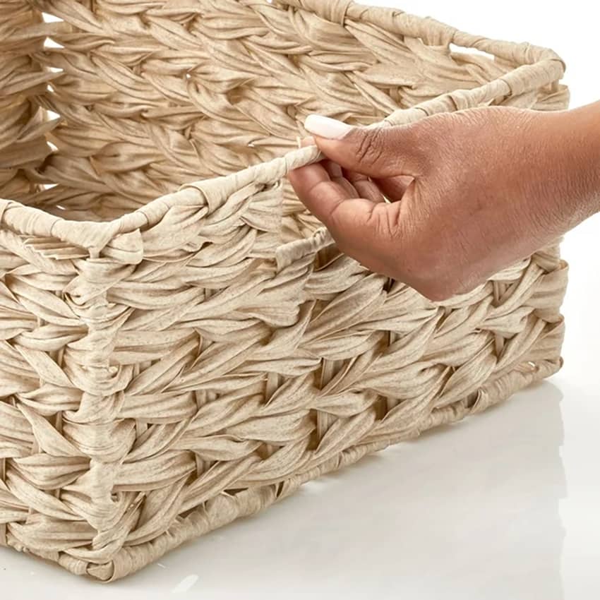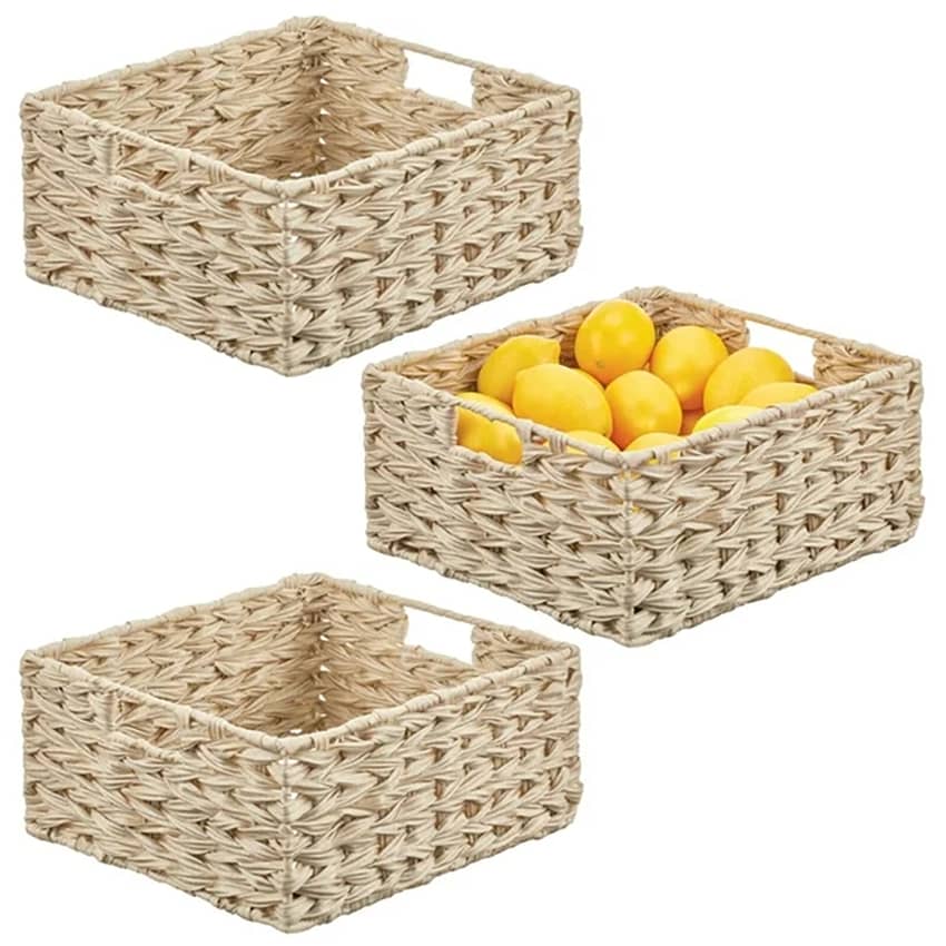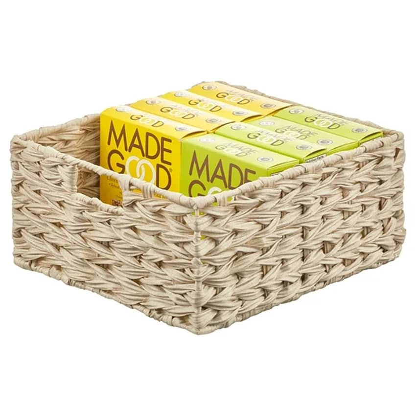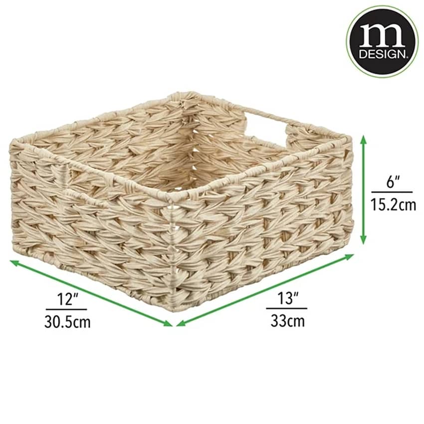 Declutter your home with ease using the mDesign Woven Pantry Storage Basket Box in Cream. This 3-pack of versatile bins is designed to keep your essentials neatly organized and accessible. With integrated handles that make transporting items from room to room easy, you can grab and go! Perfect for creating a cohesive storage system, you can use them together for a larger organizational set or separate them for coordinated storage throughout your home. Crafted from durable plastic strips woven over a sturdy steel frame, these baskets offer a stylish and practical solution for living rooms, linen closets, entryways, and more. These basket boxes measure 13 inches long, 12 inches wide, and 6 inches high.