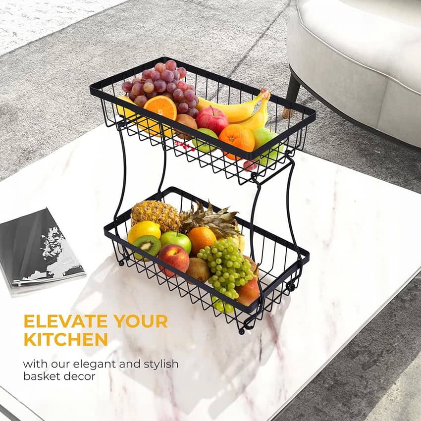 - This stylish two-tier fruit basket adds a touch of elegance to your kitchen. It not only keeps your fruits and vegetables fresh and accessible but also enhances your kitchen decor