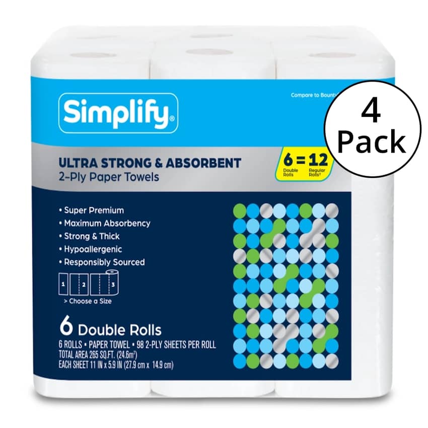 Simplify Ultra Strong & Absorbent 2-Ply Paper Towels, 6 Rolls, 4 Pack