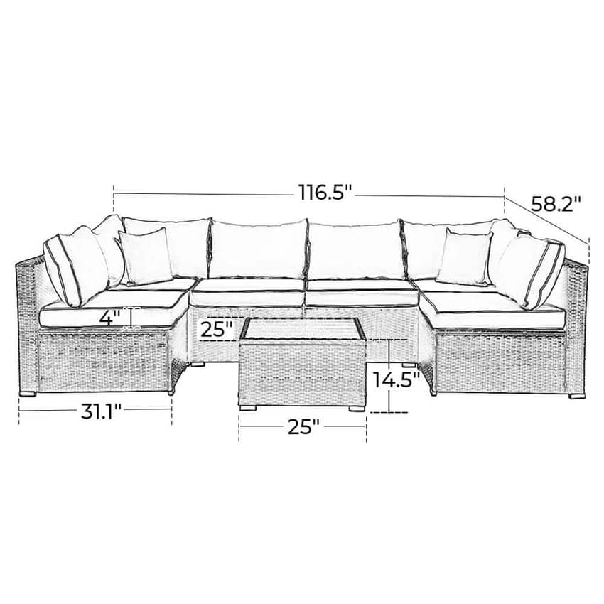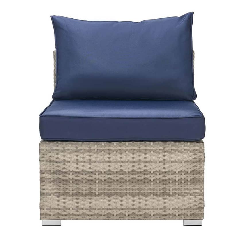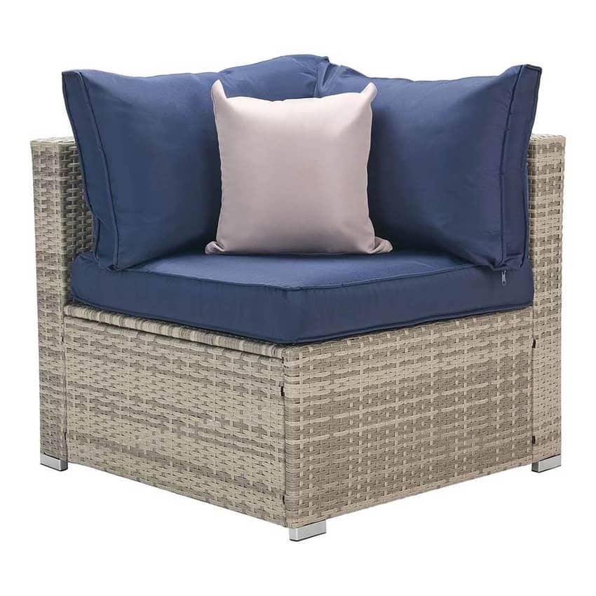 This all-weather seven-piece resin wicker patio sectional is the ultimate addition to any outdoor living space. The durable steel frame is wrapped with a gorgeous beige resin wicker that is UV- and fade-resistant. The powder-coated steel frame provides rust resistance and durability, while the navy blue and beige cushions are upholstered in outdoor-rated, water-resistant, 100-percent polyester. And with a four-inch thickness, these cushions provide the perfect comfort level for you and your guests. Each cushion also has piping to give a designer look to this flexible set, and two beige decorative pillows are included for added style. The faux-wood top coffee table makes this set even more maintenance-free. With two corner seats and four armless seats, this set can seat up to six people, and it can be configured in different ways to suit your outdoor needs. The cushion covers are machine washable and have zippers for easy removal. The coffee table measures 25 inches long, 25 inches deep, and 14.5 inches high, and the overall dimensions of the sectional are 116.5 inches wide, 31.1 inches deep, and 27.56 inches high. This seven-piece set has a total weight of 176 pounds.