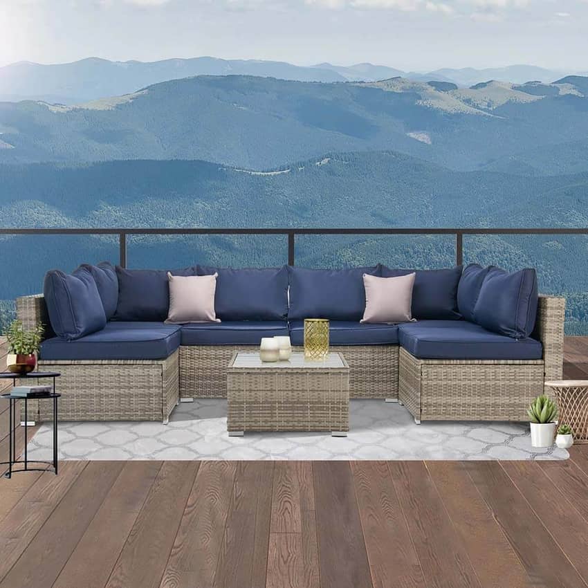 - All-Weather 7-Piece Resin Wicker Patio Sectional, Navy/Gray