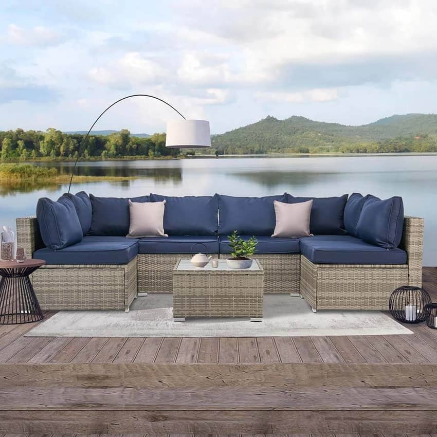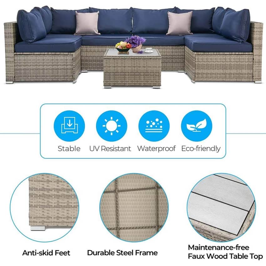 All-Weather 7-Piece Resin Wicker Patio Sectional, Navy/Gray
