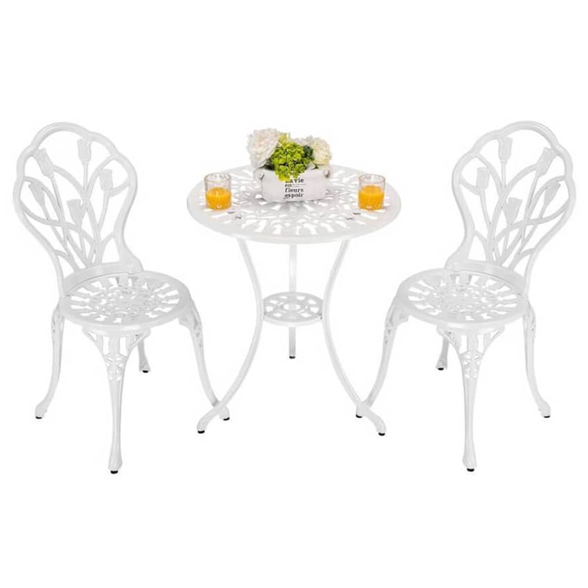- 3-Piece Cast Aluminum Outdoor Bistro Set with Tulip Design, White