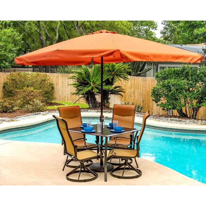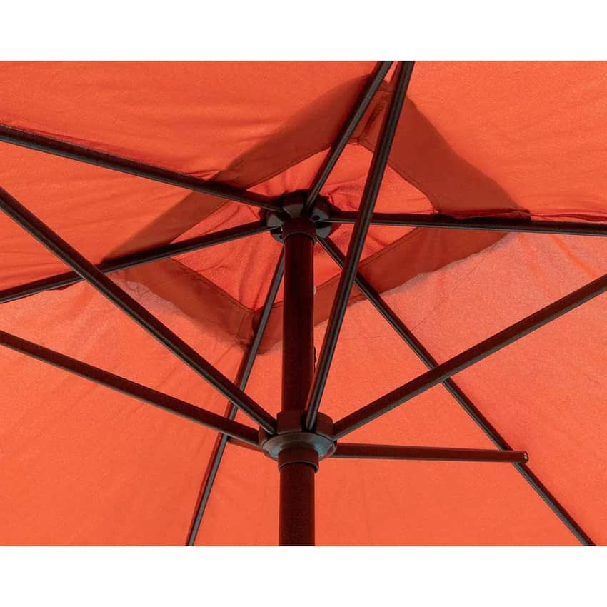 Bring shade and style to your patio with the Pebble Lane Living Rectangular Market Patio Umbrella in Brick. This large umbrella provides ample shade for you and your outdoor furniture, making it a great choice for creating a comfortable shaded area. The easy-to-use crank handle opens and closes the umbrella quickly, while the vented top allows air to circulate and helps prevent the umbrella from inverting in strong winds. The UV-treated canopy protects you from harmful UV rays, and the aluminum and steel frame with a polyester canopy is built to withstand wind, rain, or shine. Please note that a base is not included with this umbrella. This umbrella measures 10 feet long, 6 feet wide, and 7.5 feet high.