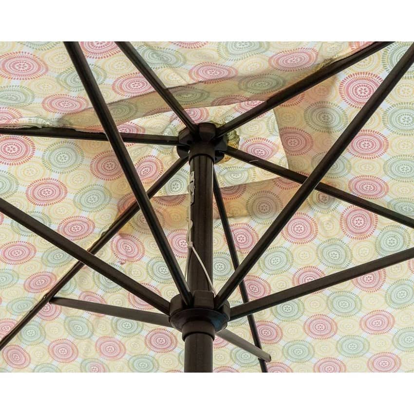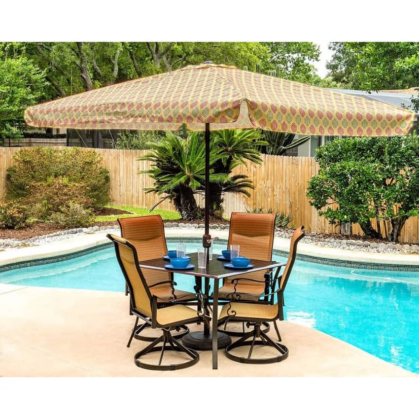Bring a touch of sunshine and shade to your patio with the Pebble Lane Living Rectangular Market Patio Umbrella in Sunburst. This large, vibrant umbrella features a cheerful sunburst pattern that adds a touch of personality to your outdoor space. The easy-to-use crank handle opens and closes the umbrella effortlessly, while the vented top allows for air circulation and helps prevent the umbrella from inverting in strong winds. The UV-treated canopy protects you from harmful UV rays, and the aluminum and steel frame with a polyester canopy is built to withstand rain, wind, or shine. Please note that a base is not included with this umbrella. This umbrella measures 10 feet long, 6 feet wide, and 7.5 feet high.