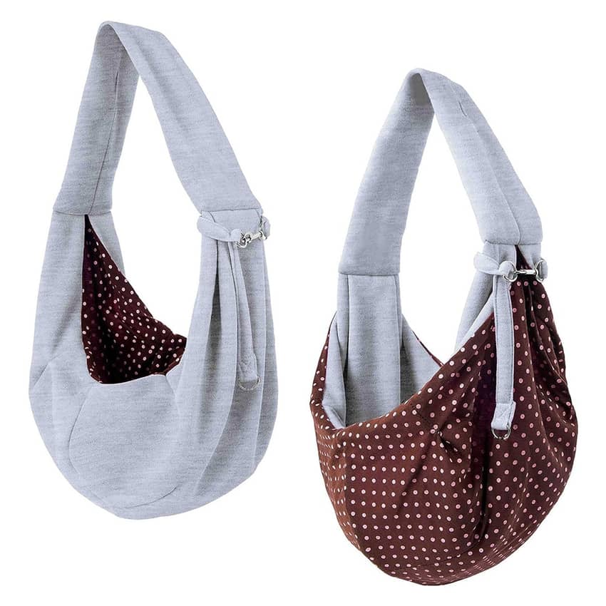 The iPrimio soft reversible pet carrier sling for dogs and cats is a great way to carry your small pet weighing under 12 pounds wherever you go. The carrier is made of reversible material that is easily washable. Change from gray to brown with white polka dots whenever you choose. It measures 20 inches wide by 14 inches deep, and the shoulder strap is 26 inches long. It comes with a security clasp to prevent your pet from jumping out. The iPrimio pet carrier sling is a great way to keep your pet close to you while you are out and about. It's also perfect for transporting your pet to and from the vet or groomer.