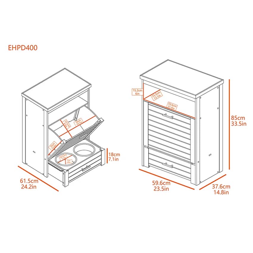 The NewAgePet Brea Pantry Pet Diner is a stylish and functional solution for feeding and storing your pet's food. Crafted from durable ECOFLEX, a non-toxic and eco-friendly wood plastic composite, this pet diner is moisture resistant for superior odor control and easy cleaning. The angled storage compartment can hold up to 25 pounds of pet food in a resealable bag, while the two stainless-steel bowls provide a hygienic and easy-to-clean feeding surface. With its quick and easy assembly and modern design, the Brea Pantry Pet Diner is a practical and attractive addition to any home and the perfect place for your pets to eat. This pet diner measures 23.4 inches long, 14.5 inches wide, and 33.6 inches high.