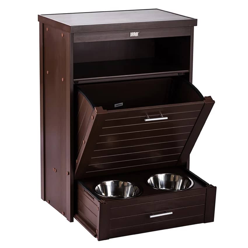 - Angled storage compartment accommodates 25 lbs. of pet food in a resealable storage bag