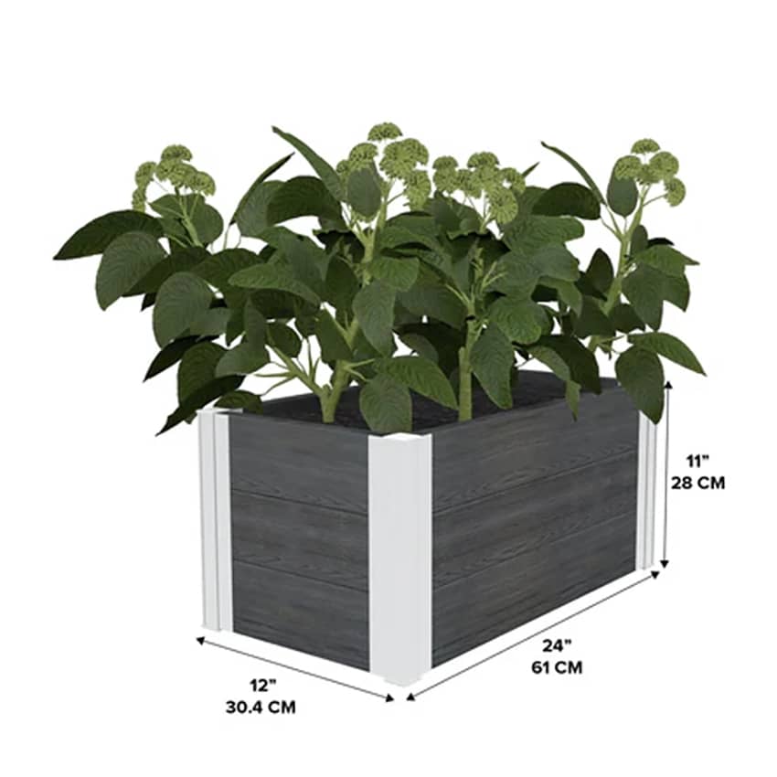 The Vita Urbana Planter combines a slate look with effortless functionality, making it a perfect addition to any home, office, or outdoor patio. Crafted from embossed PVC, this planter provides the classic, natural look of wood with the lightweight, weather-resistant durability of high-quality vinyl. It is BPA and phthalate-free, ensuring a safe environment for growing herbs and vegetables while promising a long product lifespan. With a 2-square-foot planting area and 2.7 cubic feet of soil capacity, it’s ideal for small-space gardening. The unit features a simple slide-in assembly that can be completed quickly with a drill and a Phillips #2 head bit, and it includes floor boards to provide a complete, stable base for your decorative plants or flowers. This planter weighs 9 pounds and measures 24 inches long, 12 inches wide, and 11.25 inches high.