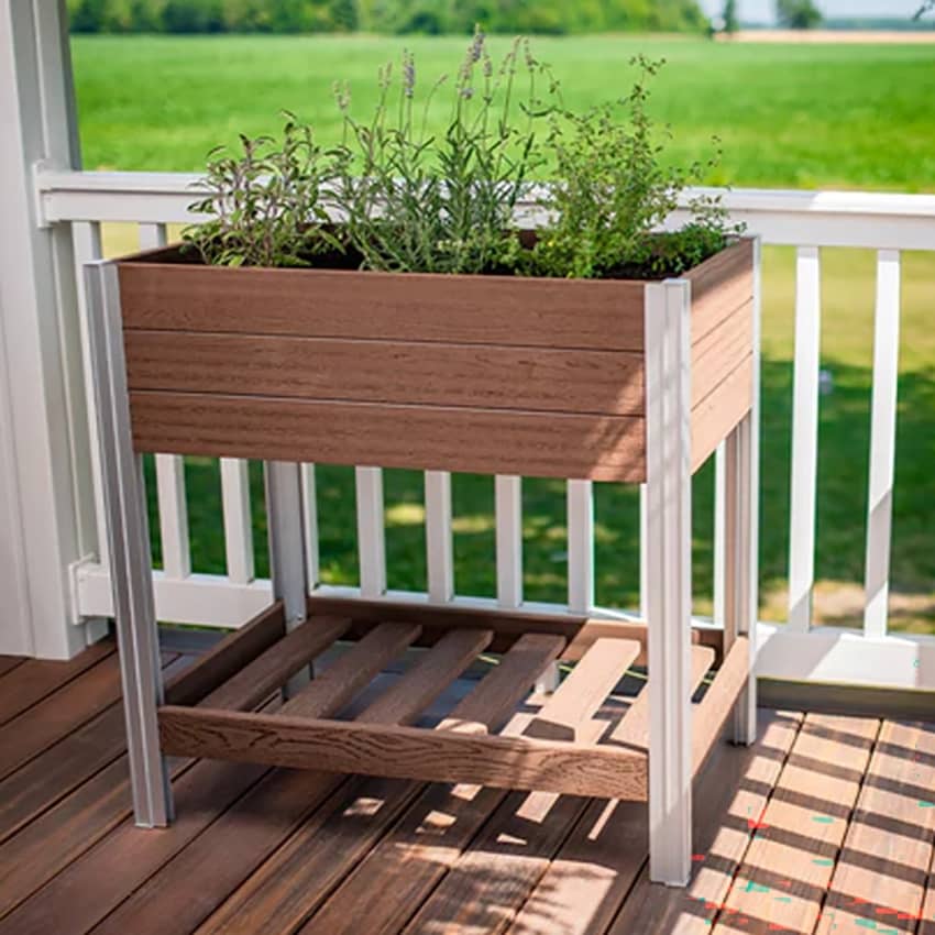 The Vita Urbana Herb Farm in Espresso blends elevated design with effortless functionality, making it the premier choice for growing herbs, vegetables, or flowers in smaller spaces. Made from an embossed, BPA and phthalate-free PVC, it offers the authentic aesthetic of natural wood combined with the lightweight durability of vinyl for a long, maintenance-free lifespan. The ergonomic, elevated height is specifically engineered to minimize back and knee strain, providing a comfortable gardening experience on small patios, decks, or balconies. With a 4.6 square foot planting area and a 3.2 cubic foot soil capacity, this unit is simple to assemble with only a drill with a Phillips #2 bit and a tape measure. While it includes floorboards for structural support, please note that the design is not water-tight; for indoor use, plants should be potted or paired with a liner to protect your living space. This herb farm has a depth of 8 5/8-inches, weighs 30 pounds, and measures 35.13 inches long, 22 inches wide, and 34 inches high.