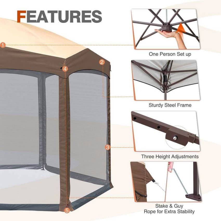 Enjoy the convenience of easy one-person setup with this 10-foot by 12-foot hexagonal pop-up gazebo. The steel powder-coated frame ensures durability, while the tan and dark brown canopy top provides ample shade for 8-10 people. The canopy is made of 150D Oxford Polyester, which is waterproof, flame-resistant, and features UPF 50+ UV sun protection. It is easy to set up with its one-person setup technology and center-locking mechanism. The legs are adjustable to three different heights, and the center-locking mechanism makes it easy for one person to set up and take down. A convenient carry bag and its weight of 42 pounds make this gazebo easy to transport, making it ideal for outdoor events such as picnics, beach trips, BBQs, and camping. This gazebo measures 12 feet long, 10 feet wide, and 9 feet high.