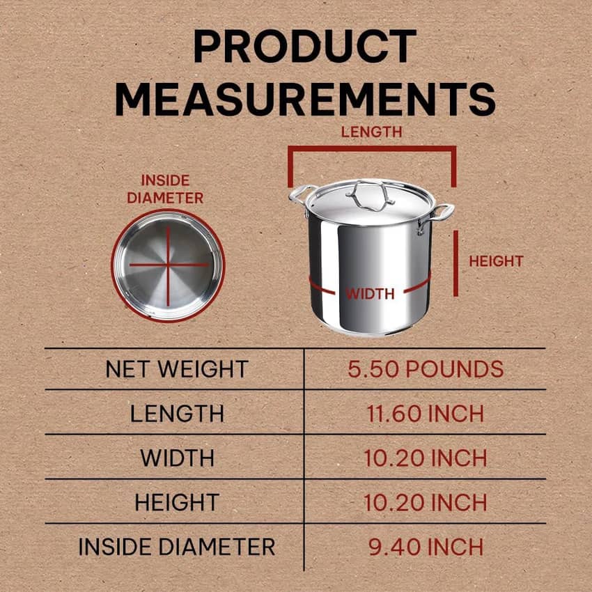The Alva Chef 10.5-quart Stainless Steel Stockpot is a workhorse in the kitchen. Its generous capacity makes it ideal for large batches of soups, stews, pasta, and more. Constructed from high-quality stainless steel with an encapsulated three-layer base, this stockpot ensures even heat distribution for consistent cooking results. The riveted handles provide a secure and comfortable grip, while the vented lid prevents boiling over and minimizes mess. Oven and dishwasher safe, this versatile stockpot is compatible with all heat sources, including induction. Importantly, it's free of harmful substances like PFAS, lead, and cadmium, ensuring a safe and healthy cooking experience for you and your family. This casserole dish has a capacity of 10.5 Quarts, weighs 5.5 pounds, has an inside diameter of 9.5 inches wide, and measures 11.6 inches long, 10.2 inches wide, and 10.2 inches high.