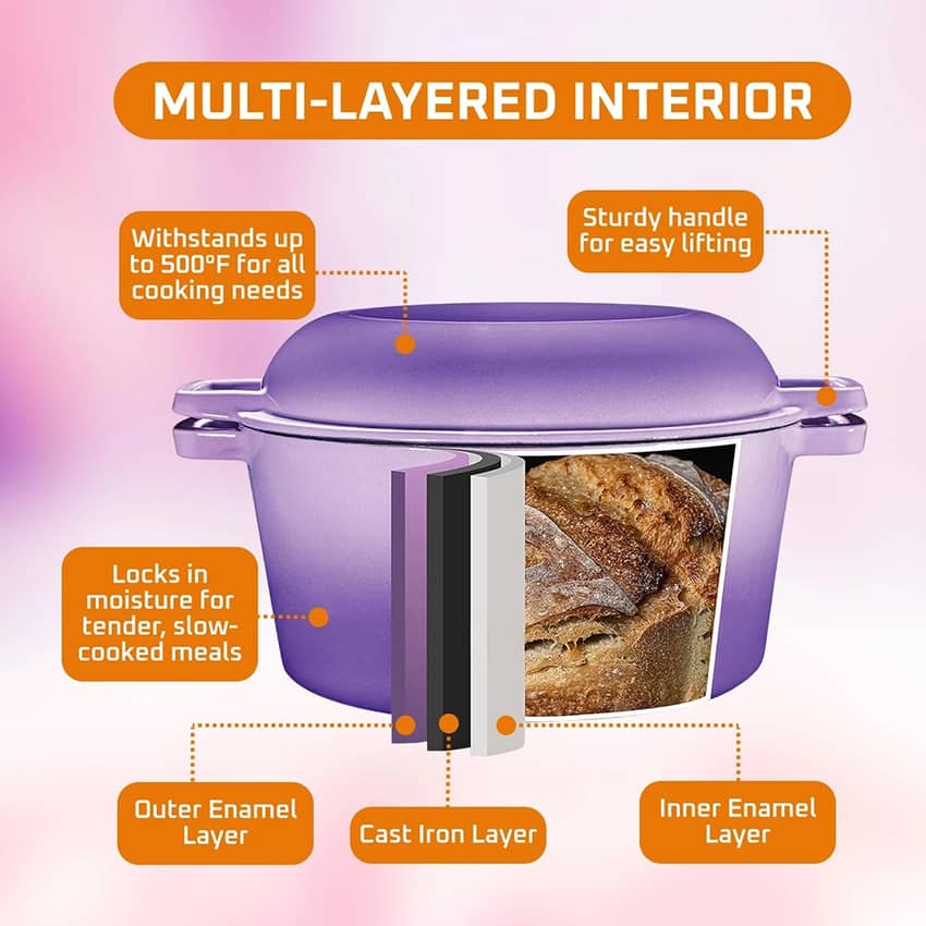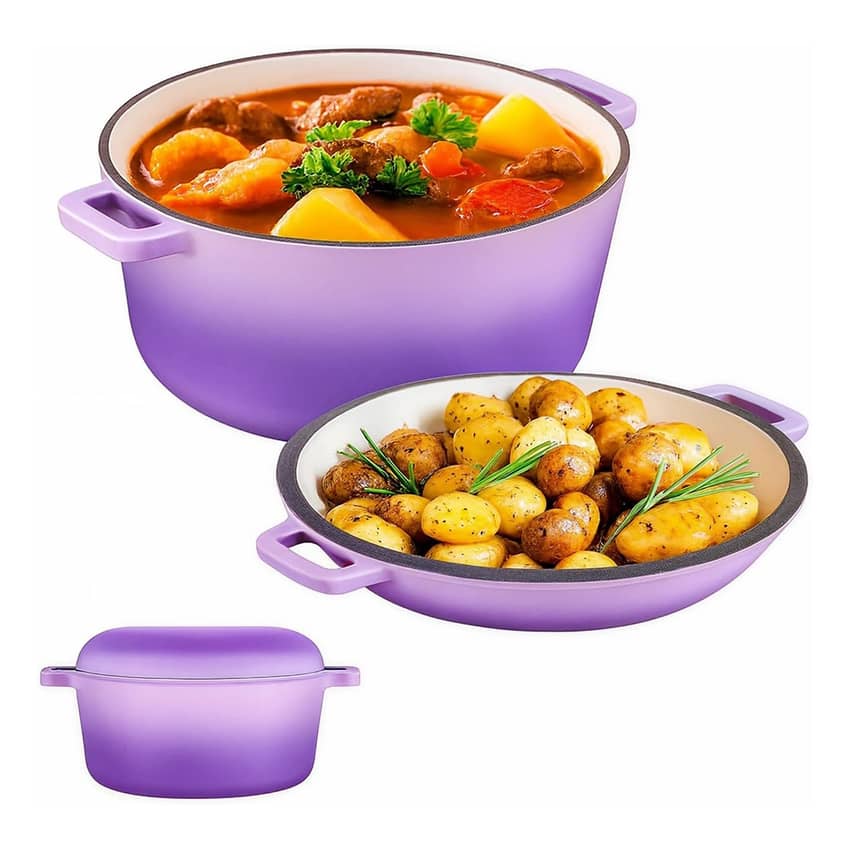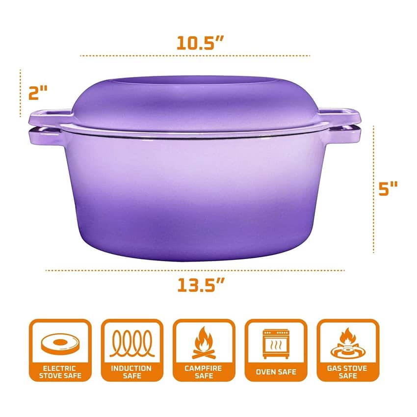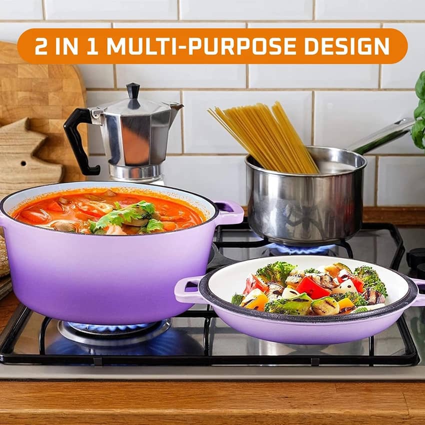 Bruntmor 5 Quart 2-in-1 Cast Iron Dutch Oven with Handles, Purple