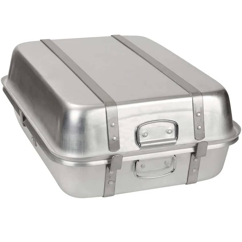 Enticing your customers is easy with this Carlisle 52 qt aluminum double roast pan. This highly durable double roast pan base is built to withstand use in busy commercial kitchens. Its extra-large size is perfect for holding multiple roasts at a time, and its aluminum design conducts and distributes heat evenly for thorough cooking. The pan is corrosion-resistant, with two steel-reinforced bands for added strength. Both base and cover can be used together or individually as open roasters. Its fabricated lugs are designed to hold the cover securely in place, and its sanitary seamless design prevents bacteria from being trapped in corners and crevices. Plus, its strong, riveted drop handles allow for safe and easy lifting. Use this versatile roast pan to prepare poultry, beef, pork, or even roast vegetables!