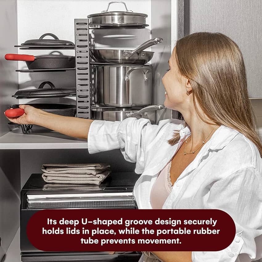 - Secure and Space-Saving Setup: The U-shaped groove and rubber-coated dividers keep cookware secure, making this pans and pot organizer ideal for protecting delicate kitchen essentials