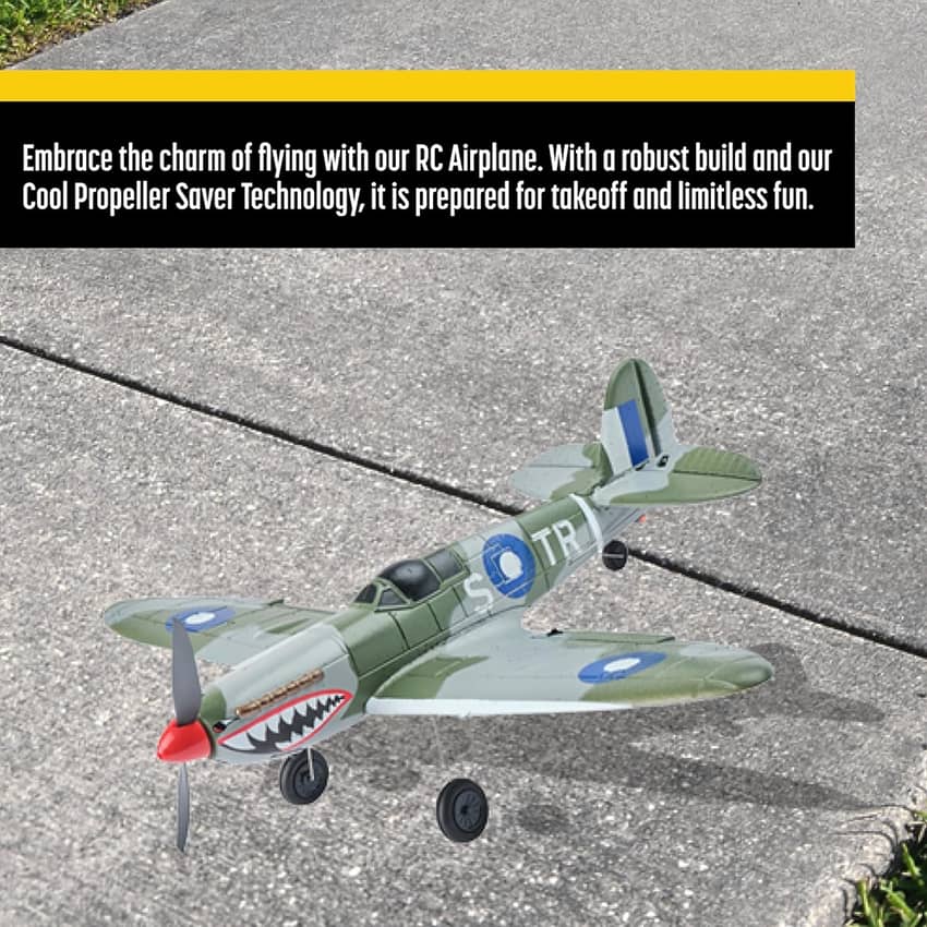 The Top Race Remote Control Spitfire Shark Mouth Airplane delivers an exhilarating flight experience with its ready-to-fly design and 4-channel control, replicating the functionality of a real aircraft. Equipped with an advanced 6-axis gyro, this RC plane ensures stable flight, catering to beginners, intermediate, and expert pilots with three adjustable control levels and a one-key stunt feature. Its high-powered motor and sturdy wheels enable smooth takeoffs and landings, complemented by a patented propeller saver technology. The 2.4GHz transmitter provides a 300-foot flying range, offering approximately 14 minutes of flight time per 120-minute charge. This silver Spitfire makes an ideal gift for aviation enthusiasts of all ages. This plane measures 11.02 inches long, 15.75 inches wide, and 5.5 inches high.