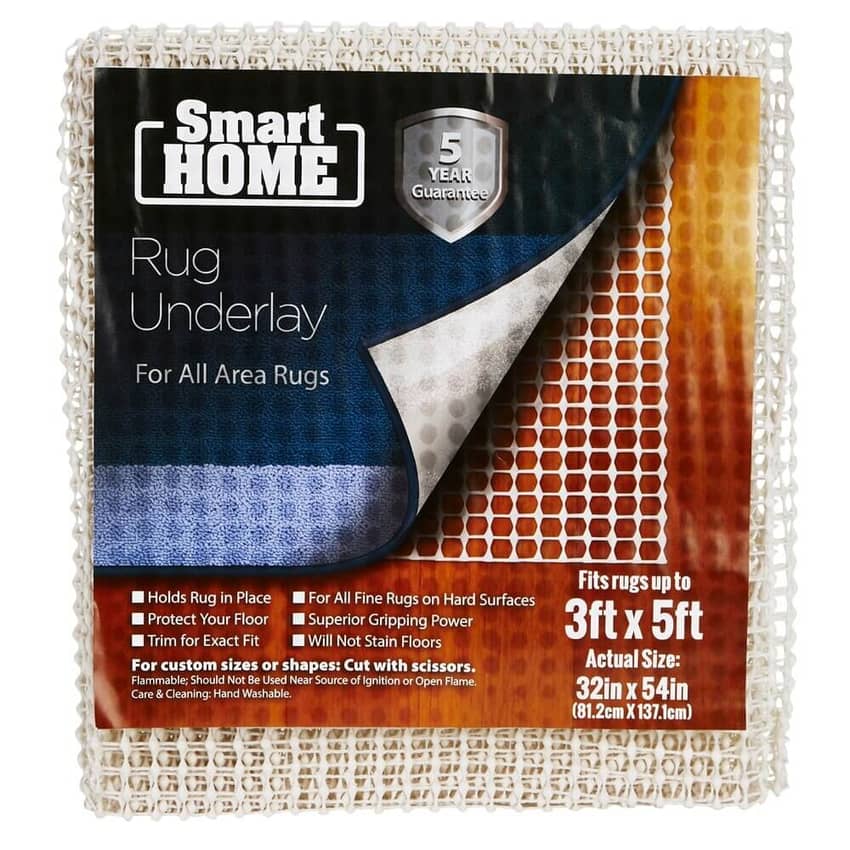 Smart Home Rug Underlay is a must-have for any fine rug placed on a hard surface. This underlay provides superior gripping power, ensuring your rug stays firmly in place and prevents unsightly wrinkles or slips. Designed to protect your flooring from wear and tear, the underlay is non-staining and won't damage your surfaces. For custom sizes or shapes, simply cut the underlay with scissors to fit your exact needs. Easy to care for, it's hand washable for effortless cleaning. With its exceptional performance and versatility, Smart Home Rug Underlay is the ideal solution for keeping your rugs secure and your floors looking their best. This rug underlay can fit rugs up to 3 feet wide, and 5 feet long.