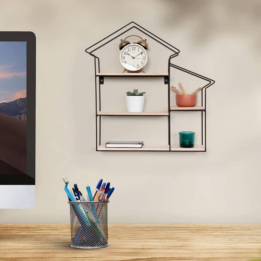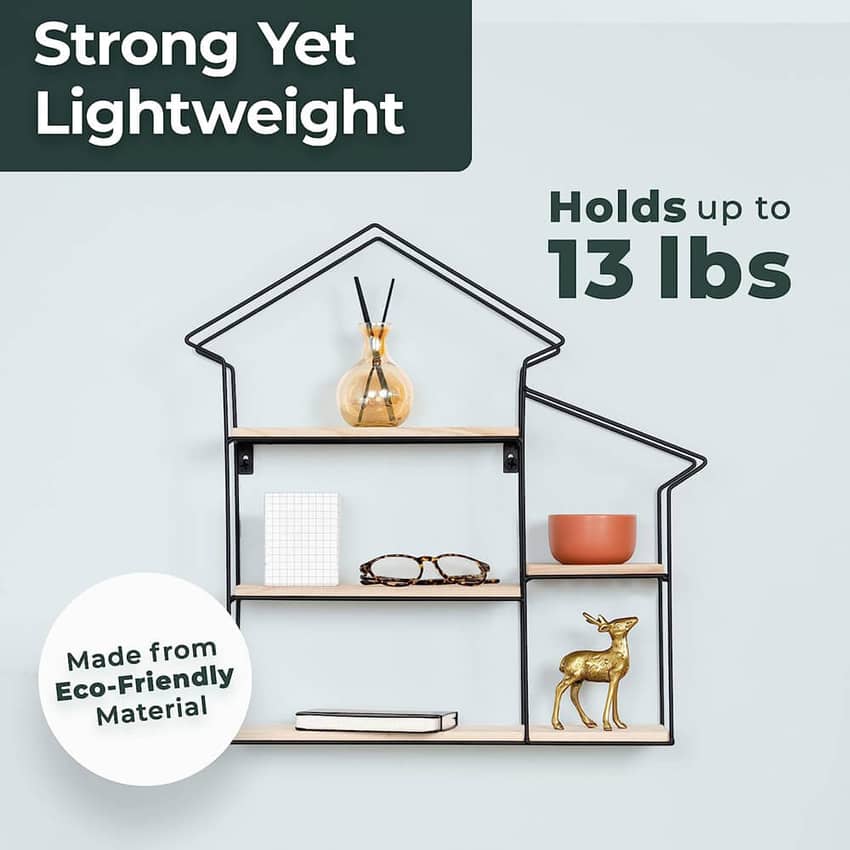 Greenco geometric house-shaped three-tier floating shelves are a decorative and functional way to add storage space to any room. They are made of durable metal wire and rustic paulownia wood, and the shelving can hold up to 13 pounds in total. The shelves are easy to assemble and mount and come in a natural/black finish that will complement most décor. It'�s perfect for kitchens, living rooms, bedrooms, kids' rooms, bathrooms, nurseries, and offices. This floating shelf unit weighs two pounds and measures 20 inches wide, four inches deep, and 19.75 inches high.
