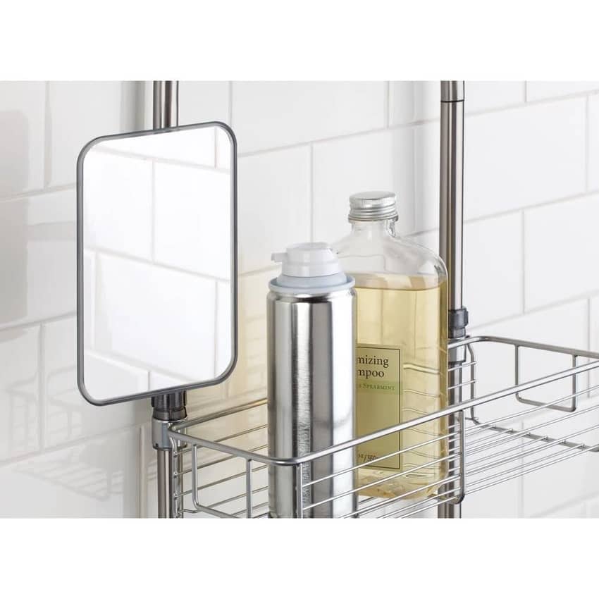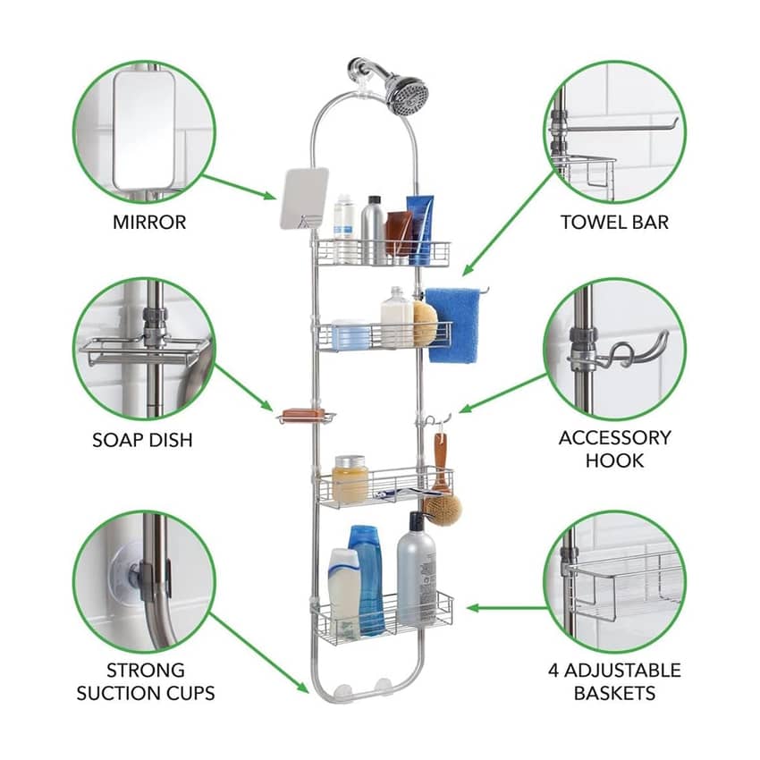 - Caddy organizer features adjustable shelves, an accessory hook, soap dish, towel bar, and mirror; Open grid design allows for maximum drainage + air circulation