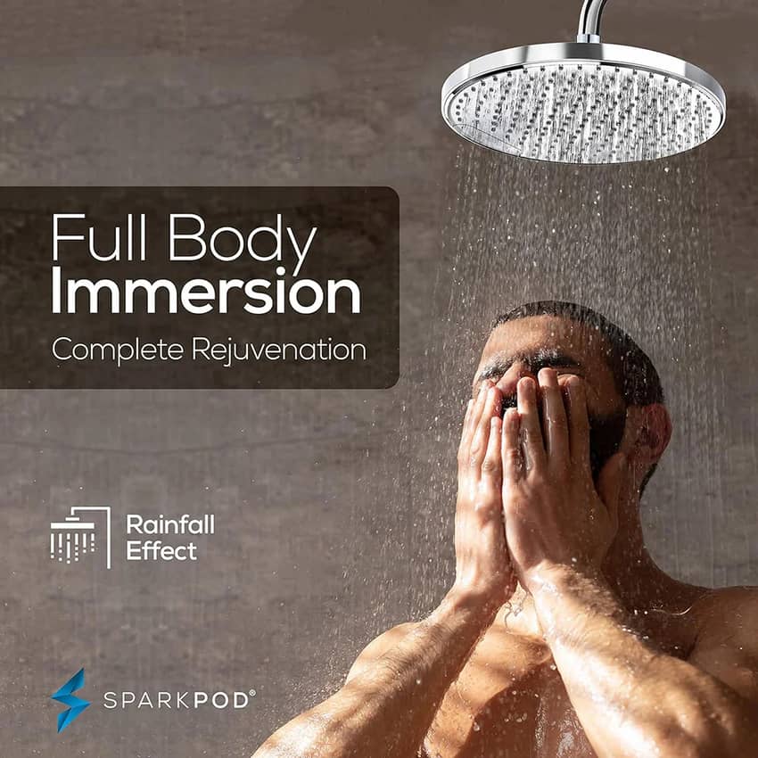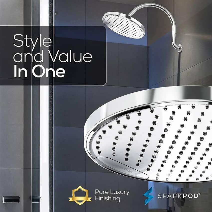 Upgrade your shower experience with the SparkPod Round Rain Shower Head in Chrome and White. This luxurious showerhead boasts a wide 10-inch diameter to ensure full body coverage, perfect for rinsing off quickly. The fixed head features easy-to-clean nozzles that remove hard water deposits with just a touch. Enjoy a customized showering experience with the SparkPod's multiple spray settings. Its modern and luxurious design complements any bathroom style, making it the perfect upgrade to your existing shower fixture. Constructed from durable, rust-proof ABS plastic, this showerhead is available in multiple color combinations to match your bathroom d�cor. The SparkPod 10" Round Rain Shower Head comes with everything you need for a hassle-free installation, including plumber's tape, a bonus restrictor to help manage water flow, an installation guide, and a quality screened washer. Universally compatible, this showerhead is easy to install and will have you enjoying a spa-like showering experience in no time. This shower head weighs 2 pounds, and measures 10 inches in diameter.