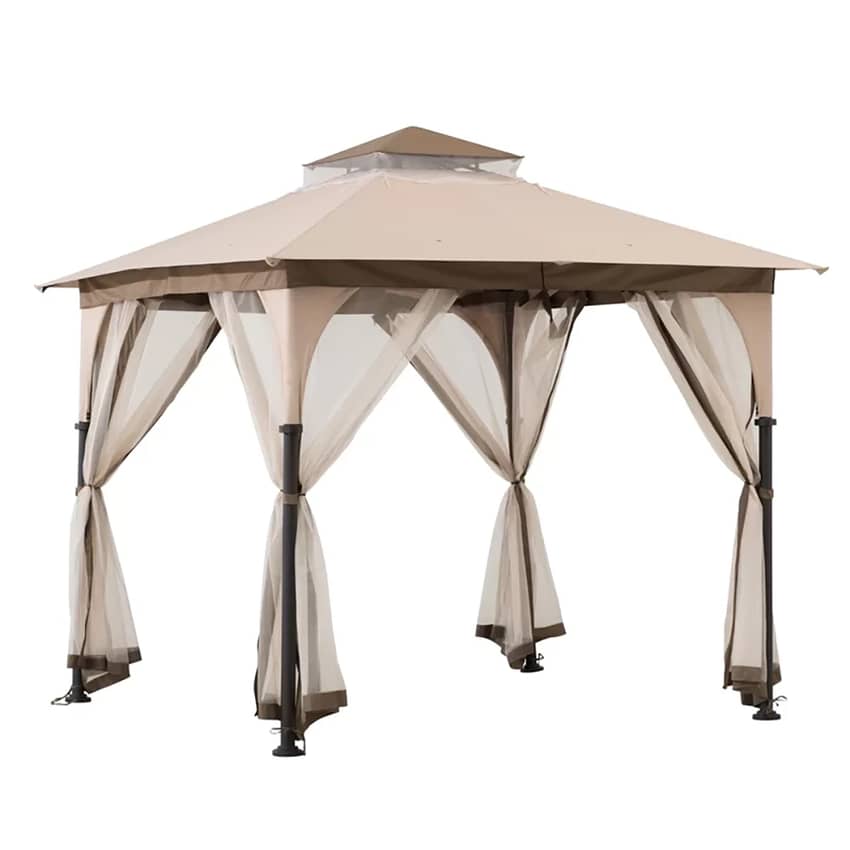 The Sunjoy Outdoor Patio 2-Tier Steel Soft Top Gazebo in Brown is a stylish and durable structure that provides shade, protection, and a comfortable gathering space. The rust-resistant powder-coated black steel frame ensures long-lasting durability, while the weather-resistant fabric canopy offers protection from the elements. The included netting panels keep insects at bay, allowing you to enjoy your outdoor space comfortably. The ceiling hook provides an opportunity to customize the space with your favorite lighting. With its easy assembly, sturdy construction, and versatile features, the Sunjoy Outdoor Patio 2-Tier Steel Soft Top Gazebo is the perfect addition to your backyard or patio. This gazebo has a wind rating of 13 to 24 miles-per-hour, weighs 67 pounds, has an interior that measures 8.06 feet wide, and 6.57 feet high, and measures 9.5 feet long, 9.5 feet wide, and 9 feet high.