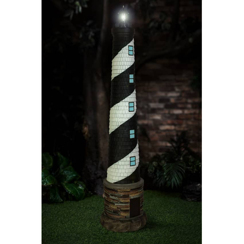 This amazing, scaled lighthouse statue charges its environmentally-friendly solar panel roof by day so it can automatically turn on its spinning LED light for up to six hours at dusk! Beautiful as an unlit sculpture on a sunny day, it is doubly dramatic as a lighted beacon near a pond, pool or garden come nightfall. This classic octagonal, Design Toscano-exclusive lighthouse statue stretches just over four feet tall and is cast in quality designer with an individually hand-painted finish. Adding instant nautical charm, this collectible focal point makes a great gift for the traveler, lighthouse collector, or the keeper of any well-appointed home.