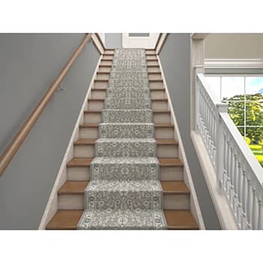 Beautify your home and protect your stairs from heavy foot traffic! This luxurious Bellevue stair runner is 26 inches wide by 25 feet long and comes in a beautiful gray pattern that complements any decor. The medium pile height of 0.43 inches means this durable rug will last and feel comfortable underfoot. Material is non-flammable polypropylene yarn on a jute backing. Made in Turkey.