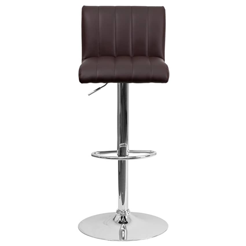 Elevate your home decor with the Contemporary Vinyl Adjustable Height Barstool in rich brown. This stylish stool features a sleek, low-back design with vertical line detailing on the plush vinyl upholstery, offering comfort and modern appeal. Enjoy 360-degree swivel capability and effortless height adjustment with a gas lift, transitioning smoothly from counter to bar height. A sturdy chrome base and integrated footrest provide stability and support. At the same time, the CAL 117 fire retardant foam ensures safety. Designed for residential use, this barstool combines practicality and sophistication while adding a touch of contemporary elegance to any space. This barstool weighs 22 pounds, has a weight capacity of 330 pounds, and measures 16.5 inches wide, 19.5 inches deep, and 33.75 to 42.25 inches high.
