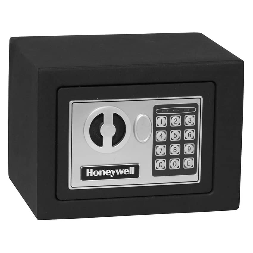 Protect your valuables with the Honeywell .17 cubic foot Digital Security Safe. This compact and easy-to-use safe features a programmable digital lock, solid steel construction, and anti-theft features to keep your belongings secure. The safe's interior is carpeted to protect your valuables from scratches, and it includes pre-drilled mounting holes and hardware for easy installation. With its sleek black finish and compact design, the Honeywell Digital Security Safe is the perfect solution for storing jewelry, cash, documents, and other valuables. This safe weighs 7 pounds, has a capacity of 0.17 cubic feet, and measures 9 inches long, 6.9 inches wide, and 6.7 inches high on the outside, and 8.9 inches long, 5,1 inches wide, and 6.5 inches high on the inside.
