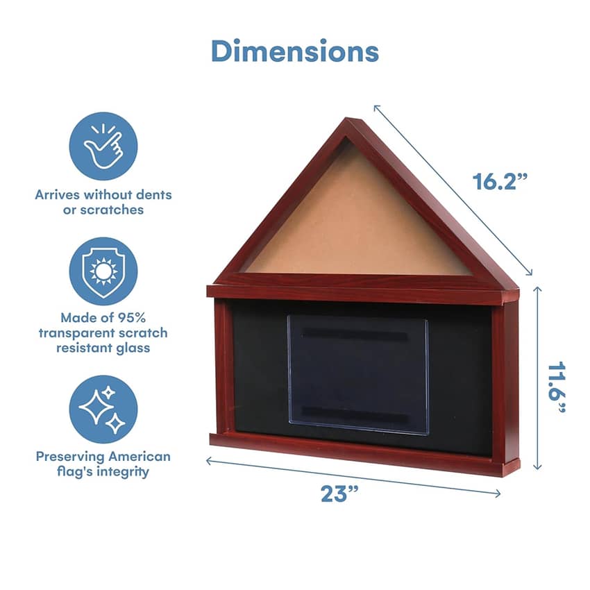 Honor your loved one's service with the Winbold Large Flag Display Case, designed specifically to fit a standard 5 by 9.5 inch veteran burial flag. This elegant mahogany finish flag frame features an anti-fade finish and a scratch-resistant glass front with 95% transparency, ensuring a crystal-clear view of the flag, medals, and certificate. The back is lined with rich, velvet-like black felt, perfect for pinning up medals and badges, while the included document holder and certificate display box allow you to proudly flaunt and protect valued documents. Complete with mounting hardware and protective packaging, this memorial flag display case provides a respectful and durable way to showcase the pride and memory of their army, military, navy, air force, or marine service. This flag display case measures 23 inches long and 11.6 inches high.