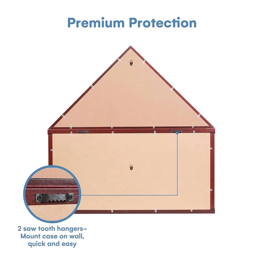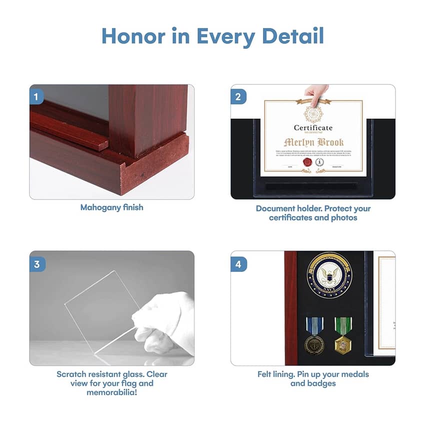 - Anti-fade mahogany finish flag frame, scratch resistant glass with 95% transparency, document holder, velvet like felt lining, mounting hardware, protective packaging