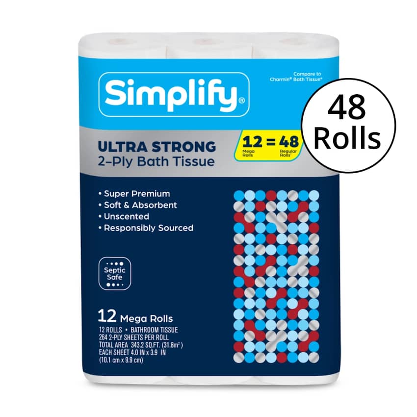 Stock up on essential comfort and value with Simplify Long Lasting Bath Tissue. This package includes 48 rolls, conveniently divided into 4 packs of 12, ensuring you're prepared for the long term. Each roll provides 264 two-ply sheets, offering a super premium experience that is both soft and absorbent. The tissue is unscented, septic safe, and crafted from responsibly sourced materials. With each sheet measuring 4 by 3.9 inches, this bulk supply delivers a total area of 343.2 square feet, making it an excellent choice for your home or business.