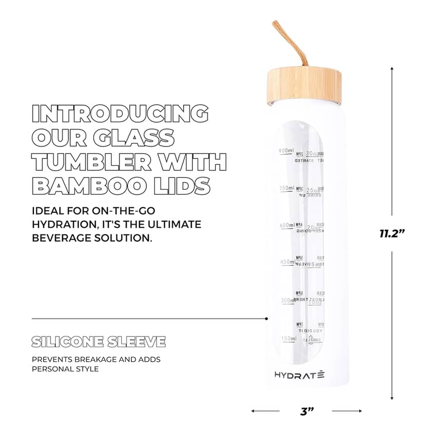 - Join the sustainability movement with our clear glass tumbler, adorned with a bamboo lid and straw. Reduce your carbon footprint in style with our glass water bottle with silicone sleeve