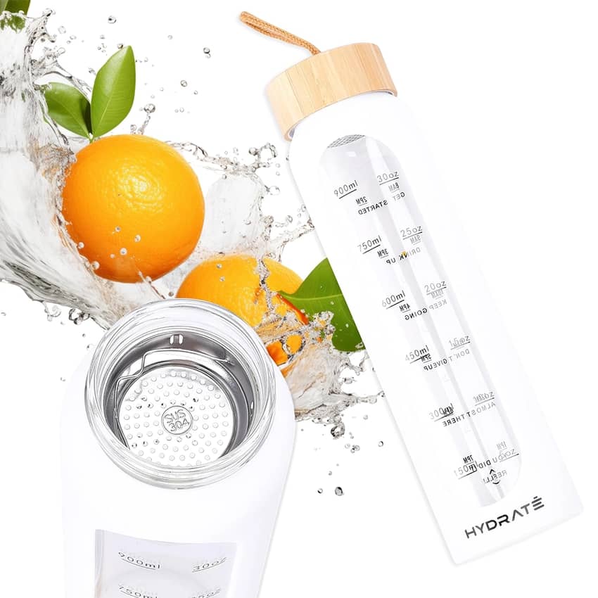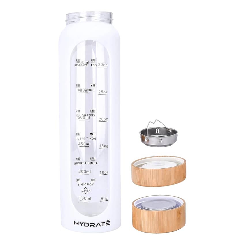 Stay hydrated and stylish with the HYDRATE 32 ounce Glass Water Bottle in white, your perfect companion for any beverage on the go. This versatile glass travel water bottle comes with a protective silicone sleeve and two bamboo lids, offering you the choice of a comfortable handle or a convenient straw for sipping. Whether it's iced coffee, refreshing water, or any other drink, you can easily monitor your intake thanks to the practical time tracker on the bottle, helping you effortlessly reach your hydration goals. Plus, this dishwasher-safe glass bottle makes cleaning a breeze, simplifying your daily routine. By choosing this clear glass tumbler with its bamboo lid and straw, you'll not only enjoy your favorite drinks but also contribute to the sustainability movement, reducing your carbon footprint in style.