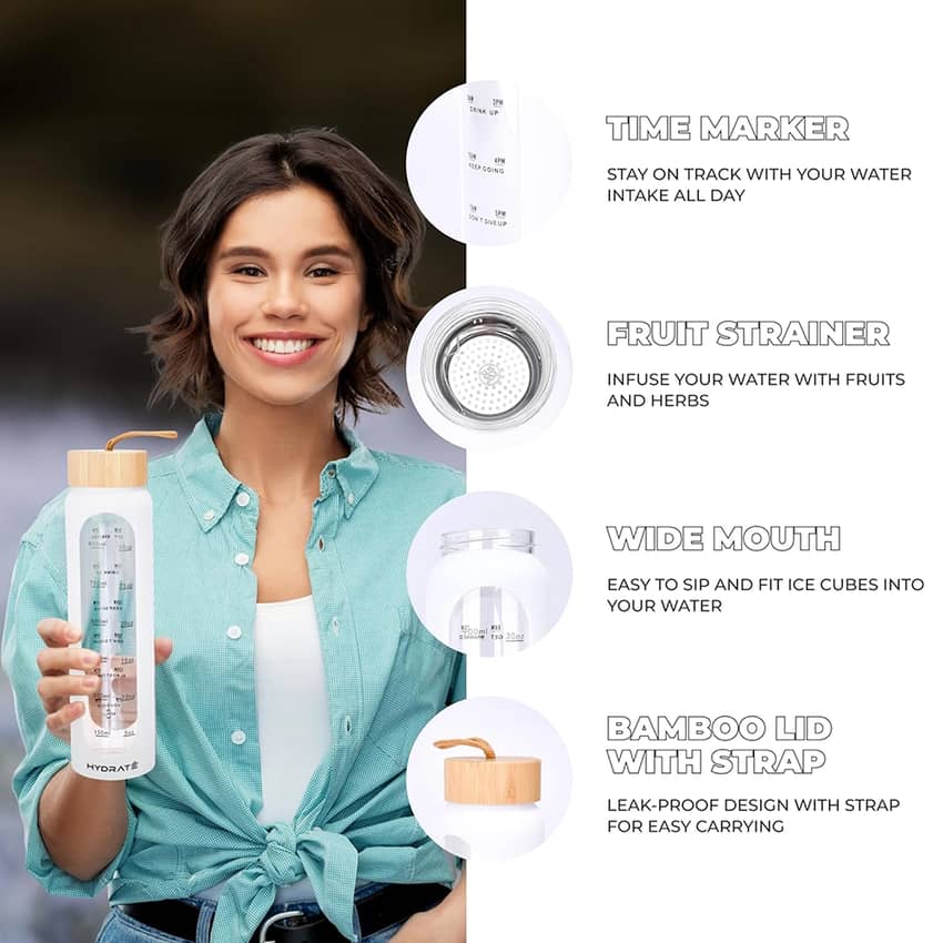 - Monitor your water intake with our glass tumbler equipped with a practical time tracker. Empower yourself with our glass water bottle and reach your health goals effortlessly