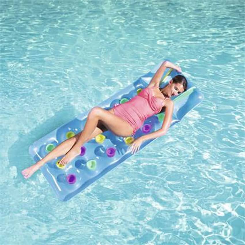 Lounge in style and comfort with the Bestway H2OGO! Inflatable Fashion Lounge. This trendy float features a secure safety valve and eye-catching multi-colored pockets for added flair. The supportive coil beam construction includes a comfortable I-beam pillow, perfect for relaxing on the water. Each package includes one inflatable lounge and a repair patch. Please note that this is not a lifesaving device, and adult supervision is essential when children are in use. Colors vary by store. Each lounge float is made from 9.6-gauge vinyl and measures 74 inches wide and 28 inches long.