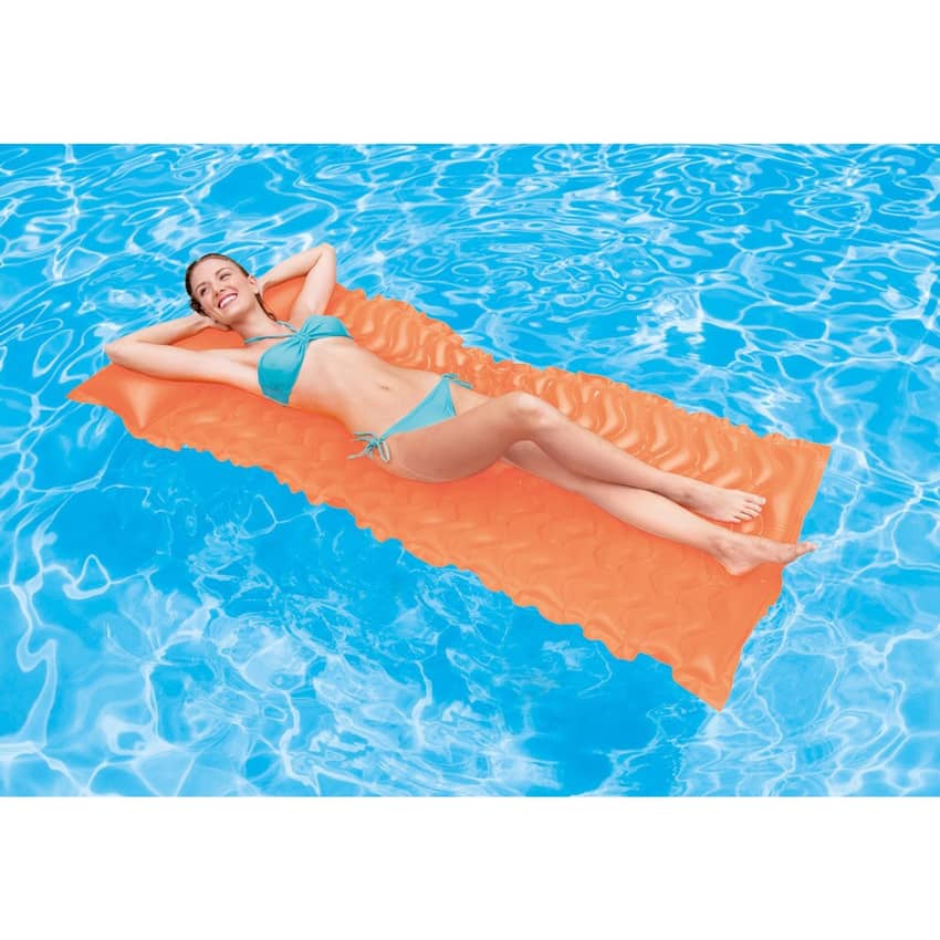 Relax in ultimate comfort on the water with the Intex Tote-n-Float Wave Mat. Designed with a built-in pillow headrest, this spacious mat is perfect for adults lounging in the pool, lake, or ocean. Its lightweight design makes it easy to tote and transport for on-the-go relaxation. Available in assorted colors, this inflatable mat offers a comfortable way to soak up the sun. Please remember that this is not a lifesaving device and adult supervision is required at all times. See product for additional important warnings. This mat measures 90 inches wide and 34 inches long. Selection varies by store.