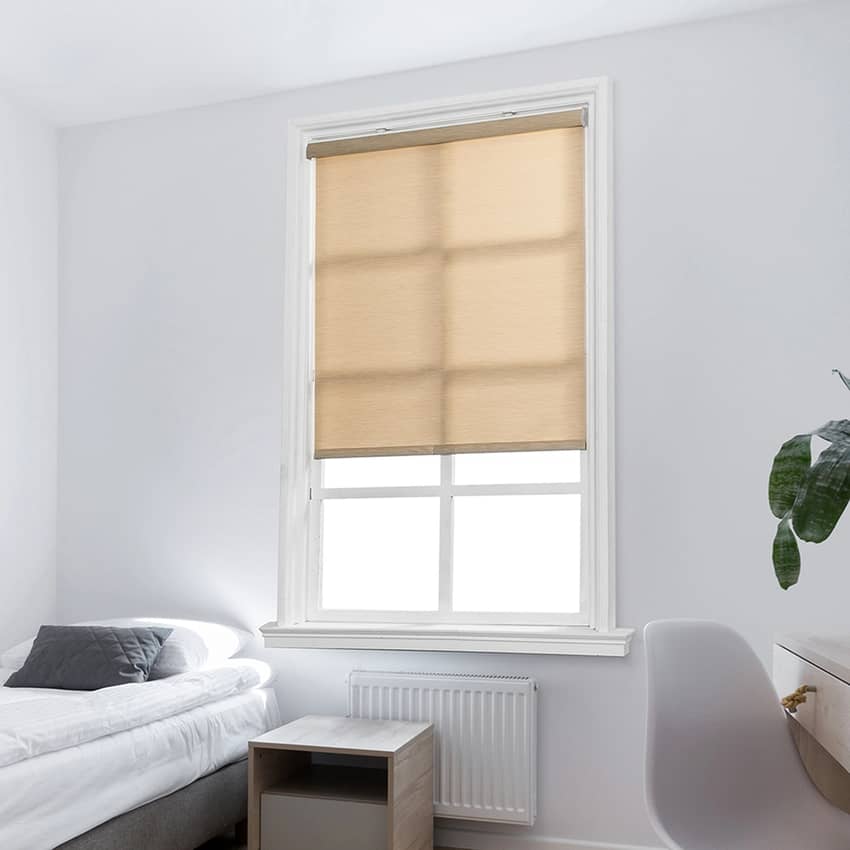 Elevate your space with the Cordless Textured Fabric Roller Shade in Sand, designed to bring a natural, modern feel to any room. This shade features a light-filtering fabric that provides semi-privacy while still allowing a soft glow to enter. Its cordless technology makes it incredibly safe for homes with children and pets, simply lift or lower the bottom rail to adjust. The included color-coordinated cassette valance with a matching fabric insert adds a seamless, polished look, and all necessary hardware and instructions are included for a quick and easy installation. The minimum depth required for an inside mount is 2 inches, and for a flush mount, it is 2 5/6 inches. For an outside mount, it is recommended that 3 inches be added to the width for full coverage. This shade measures 66 inches long and 39 inches wide.