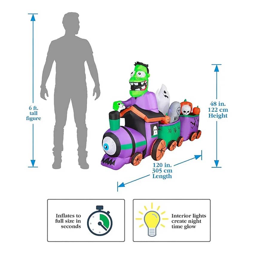 Bring spooky fun to your Halloween display with the 10-foot-long Inflatable Halloween Train! This massive inflatable is sure to catch the eye of neighbors, guests, and passersby. The colorful yet creepy train features a collection of spooky passengers, including jack-o-lanterns, a skull, a ghost, and a big green monster as the engineer. A giant eyeball leads the way, pulling cars decorated with spiders and bats. Internal lighting casts a warm glow, making this train especially festive at night. Setting up is a breeze � just secure it with the included stakes, plug it in, and watch the magic inflate in seconds! Made of durable polyester, the train deflates quickly for easy storage after Halloween. Perfect for both indoor and outdoor use, this inflatable Halloween Train is a guaranteed showstopper for your spooky celebrations. This delightfully spooky inflatable measures 120 inches long, 31 inches wide, and 48 inches high.