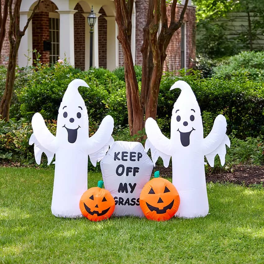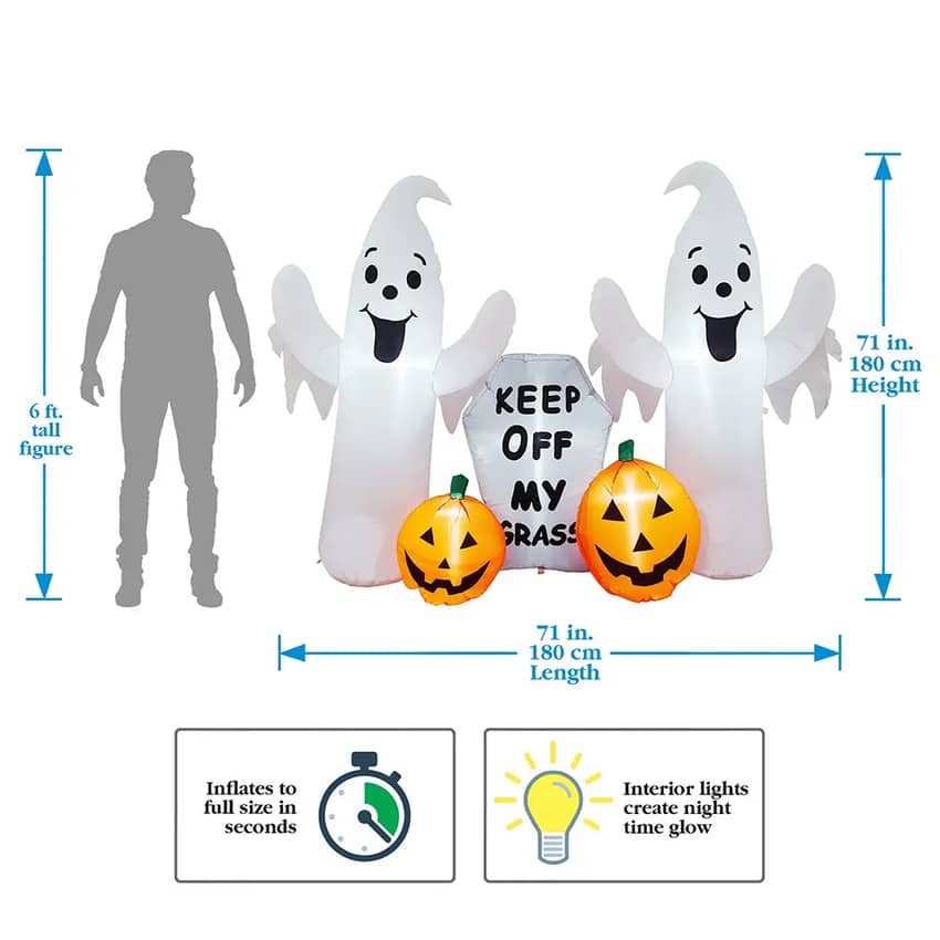 Create a family-friendly Halloween scene with this six-foot inflatable! Two smiling ghosts with outstretched arms playfully hover beside a tombstone that reads "Keep off my grass�. A pair of grinning jack-o-lanterns add to the festive atmosphere. The inflatable lights up from within, casting a warm glow that's especially noticeable at night. Setting up this decoration is a breeze: simply secure it with stakes, plug it in, and watch it inflate in seconds. Made of durable polyester, this inflatable is built to last through Halloween and deflates quickly for easy storage. This inflatable is perfect for both indoor and outdoor use and is sure to delight trick-or-treaters and visitors of all ages. It measures 71 inches long, 35 inches wide, and 71 inches high.