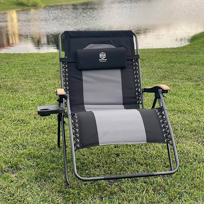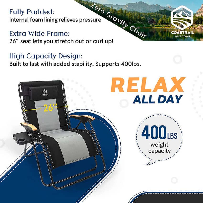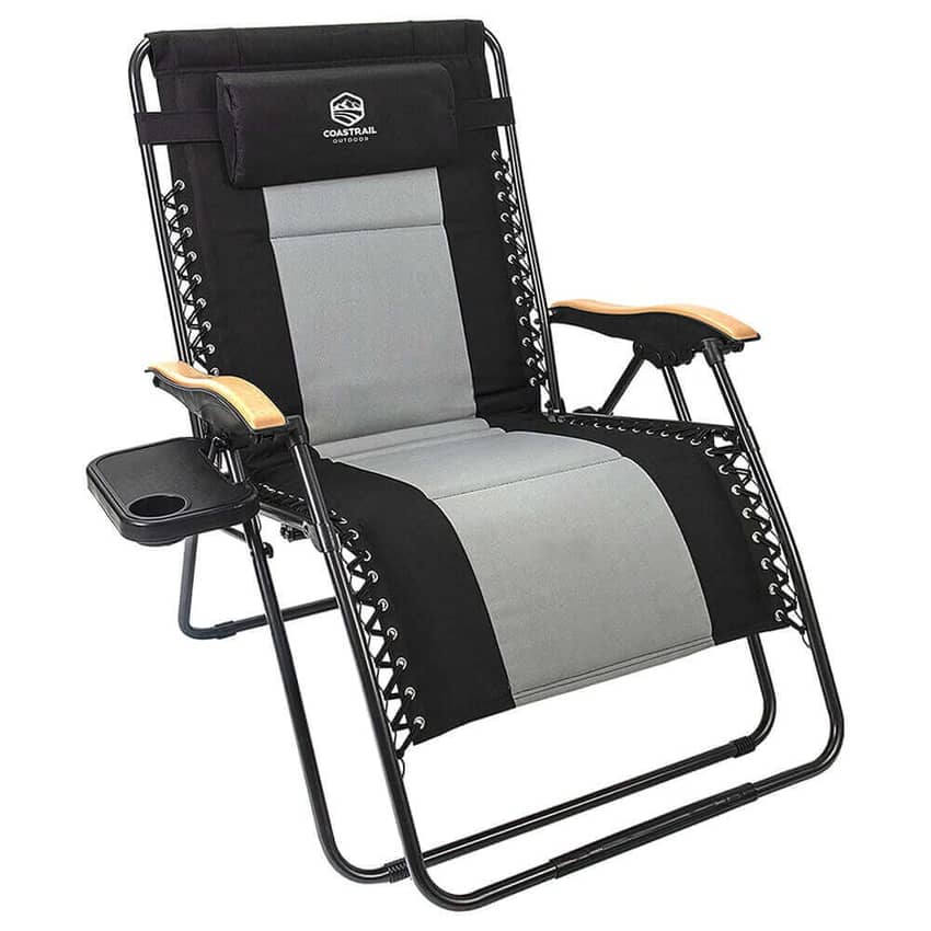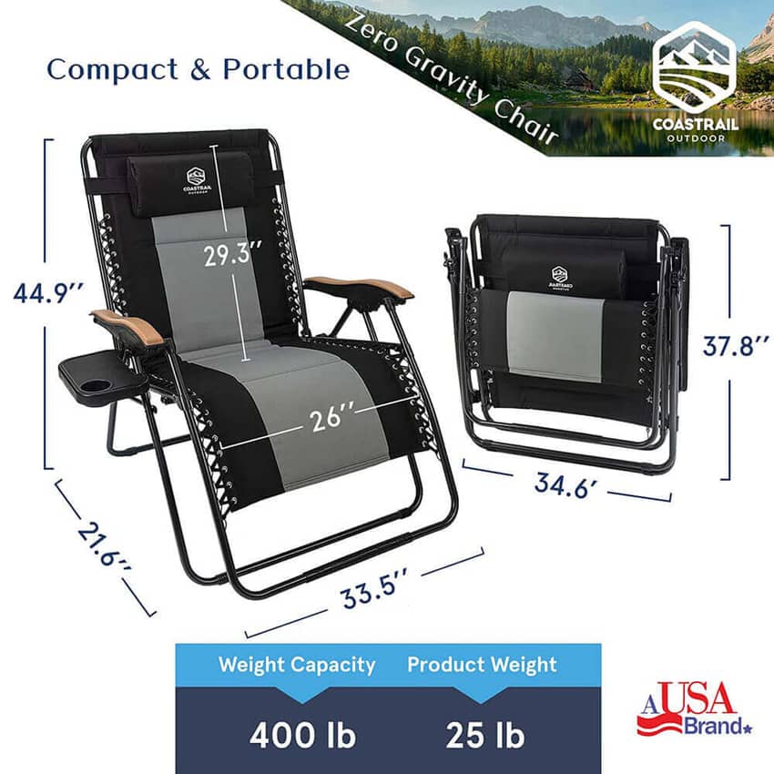 The outdoor folding zero-gravity chair by Coastrail will have you relaxed in no time! This chair is loaded with incredible features like a side table with cupholders that can attach to either side of your chair and a moveable padded pillow that can be used for lumbar support or as a headrest. Designed to be as sturdy as it is comfortable, this chair boasts a padded seat and seatback made from 600-denier polyester canvas attached to the 33.5-inch wide frame with a double bungee cord system for extra comfort. The smooth recline feature lets you rest in any position and has a metal locking pin to keep you there. (Make sure you remove the pin before sitting upright again.) Weight capacity 400 pounds. Chair weighs 25 pounds. Open chair measures 33.5 inches wide by 21.6 inches deep by 44.9 inches high. Folded chair measures 33.5 inches wide by 5.9 inches deep by 37.8 inches high.