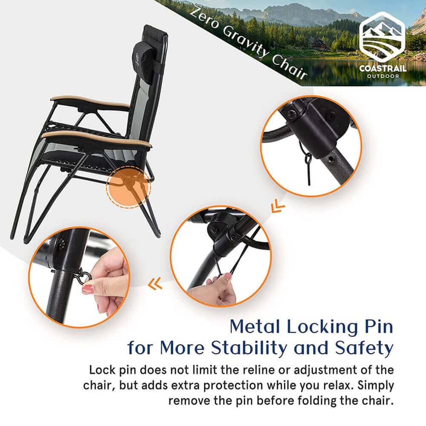 - Smooth Recline: No pre-set locking positions mean you are in control of any position of your choice. As an additional safety feature, a metal latch pin can prevent the chair from folding when in use. Just be sure to remove it before folding the chair